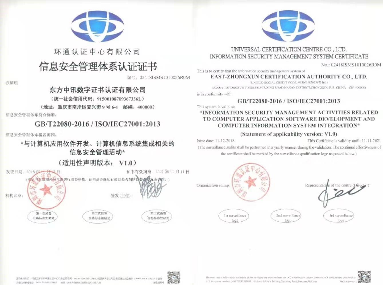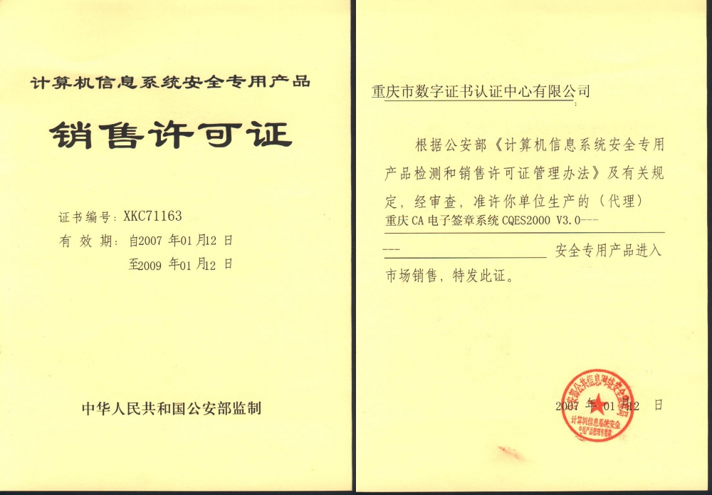 公司獲得了國家密碼管理局頒發(fā)的《電子認證服務使用密碼許可證》、國家工信部頒發(fā)的《電子認證服務許可證》、公安部頒發(fā)的《計算機信息系統(tǒng)安全專用產品銷售許可證》、擁有“雙軟”和國家級高新技術等資質稱號,是國家發(fā)改委信息化示范單位,國家信息產業(yè)基地龍頭企業(yè)。