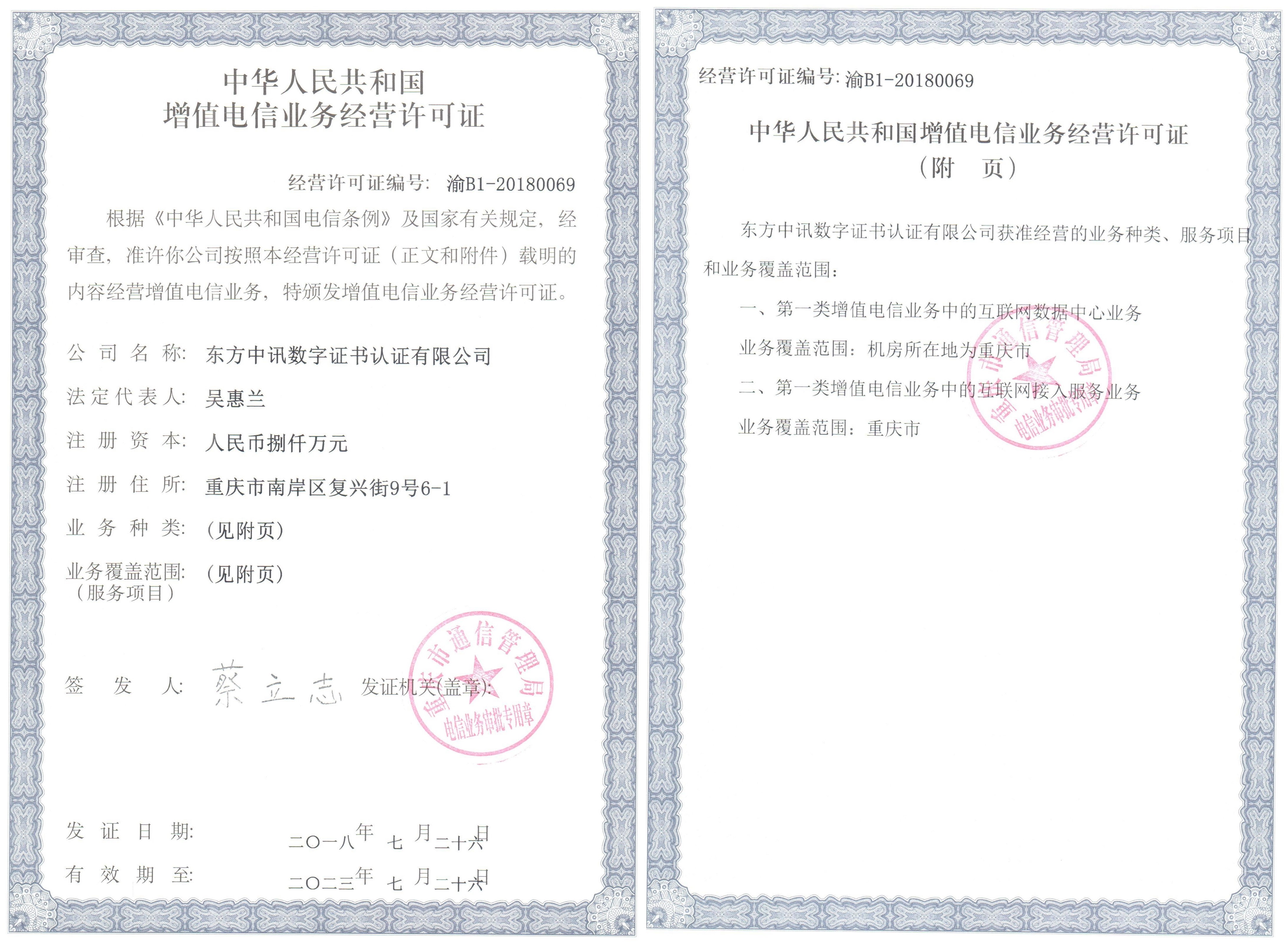 東方中訊數(shù)字證書認證有限公司成立于2001年,注冊資本3000萬元,主要從事電子認證服務、信息安全產品研發(fā)與服務、信息安全服務、增值電信業(yè)務等業(yè)務,是國家密碼管理局、工信部許可的全國性合法從事電子認證服務的第三方權威機構,是可以信賴的、專業(yè)的信息安全服務機構。